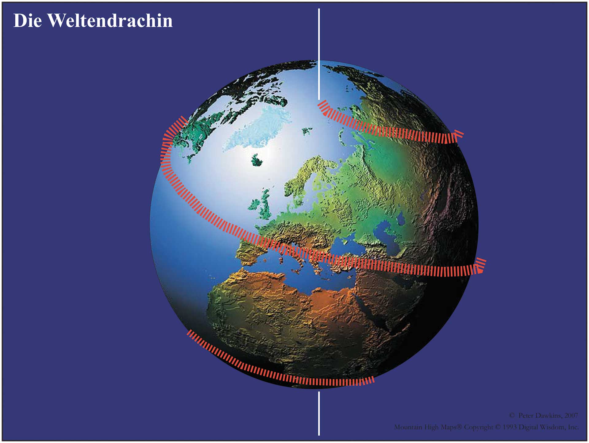 P. D.: Das magnetische Feld macht sein eigenes Ding, aber es gibt einige Schlüsselpunkte, wo sich die mehr ätherische Energie damit verbindet. Dort sind in der Regel auch die Chakren. In der Geomantie und dem Feng Shui lernt man, dass es mehr als nur eine Ebene von Energie gibt. Ich habe viele Jahre damit verbracht, die Chakren des Planeten Erde zu erkunden, und konnte einfach kein Muster darin erkennen. Es waren auch andere Menschen daran beteiligt, aber keine ihrer verschiedenen Ideen hat sich richtig angefühlt. Dann bekam ich das Geschenk einer Vision von der Welt als Ei, um die sich eine Schlange dreieinhalbmal windet, ein sehr lebhaftes Bild. Also habe ich es auf eine Karte übertragen. Die Orte waren mir klar, auch die Lage des Meridians – aber ich habe mich gewundert, warum es nicht drei Mal war, sondern eben dreieinhalb Mal. Aber alles ist Dualität: männlich – weiblich, Licht – Dunkelheit. Deshalb gibt es auch das Ideal und die Wirklichkeit als Dualität. Was in der Landschaft zum Ausdruck kommt, ist die Wirklichkeit, aber es steht ein Ideal dahinter. Dreieinhalb ist die Wirklichkeit, drei Mal das Ideal. Wie auch die Leylines als gerade Linien das Ideal darstellen – aber in der Landschaft kann man nicht in geraden Linien gehen. Die alten Ägypter haben mit beiden Werten gearbeitet, auch die Kelten. Das war für mich absoluter Beweis, dass die Vision akkurat war. Auch meine vorangegangene Recherche hat in dieses Schema gepasst, und auf einmal haben viele Dinge erstmals Sinn ergeben.