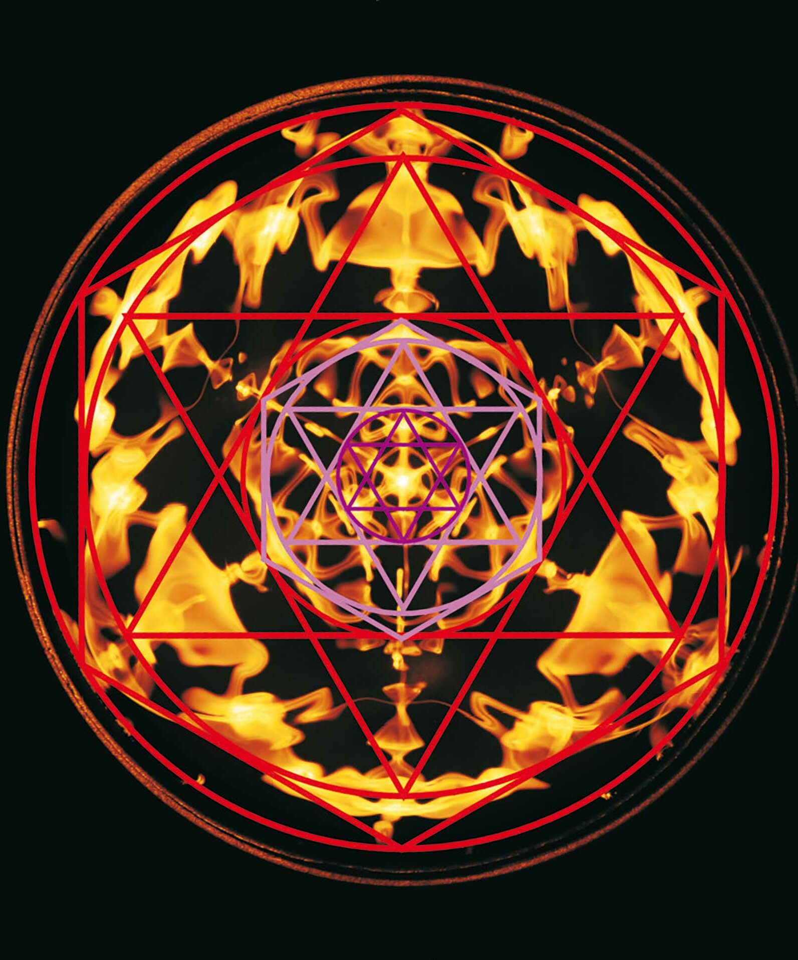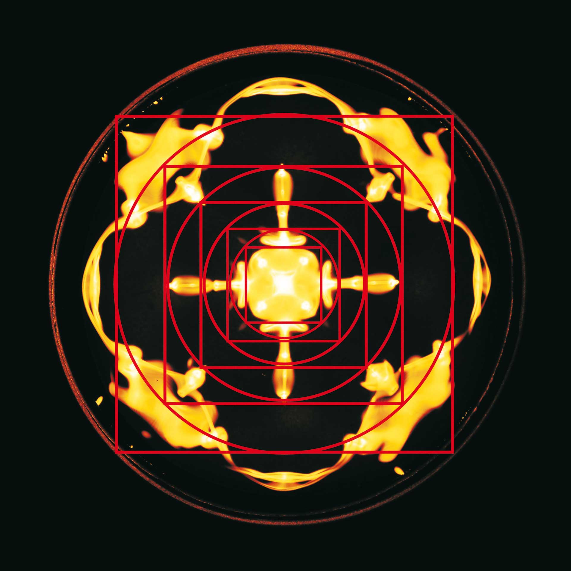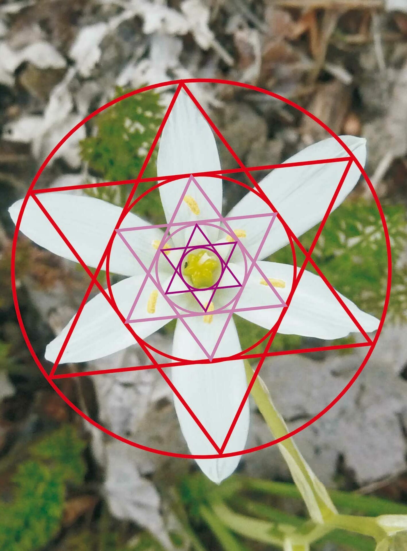 Die übergeordnete Struktur – wir könnten auch von Architektur sprechen – wird in allen drei Bildern von ineinander liegenden Sechssternen mit Um- und Inkreisen vorgegeben. Man kann es auch so ausdrücken, dass die Geometrie der einfachen regelmäßigen Figuren die Proportionen der Gestalt bestimmt. Bei Planetenfigur und Blüte reichen dazu Sternfiguren aus, beim Wasserklangbild tritt noch das Sechseck hinzu. Und diese gestaltgebenden Figuren oder Archetypen sind unsichtbar. Gestaltbildung ist demnach etwas, was aus dem Unsichtbaren gesteuert wird.