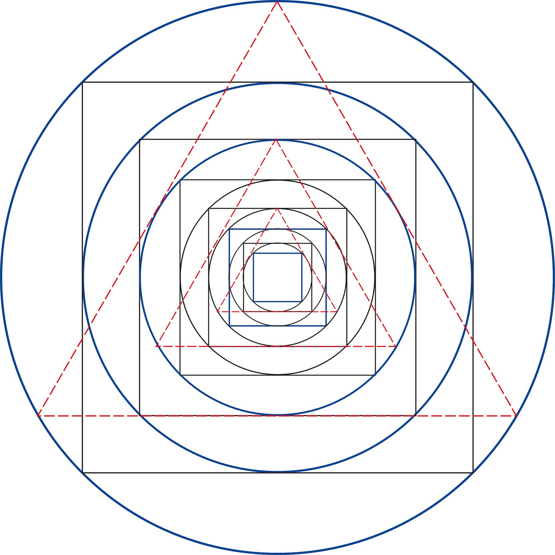 Bezogen auf die Flächen ergibt sich somit eine Reihe der Potenzen von Zwei, in die auch die Sterne der geraden Zahlen einbezogen sind. Musikalisch entspricht das wiederum der Reihe von fortlaufenden Oktaven. Geometrisch lässt sich das darstellen, indem Quadrate mit Umkreisen verschachtelt werden, denn zwei Quadrate entsprechen einem Dreieck (siehe Abb. 7). Daraus folgt, dass die Proportion zwischen Um- und Inkreis beim Quadrat 2:1 beträgt.