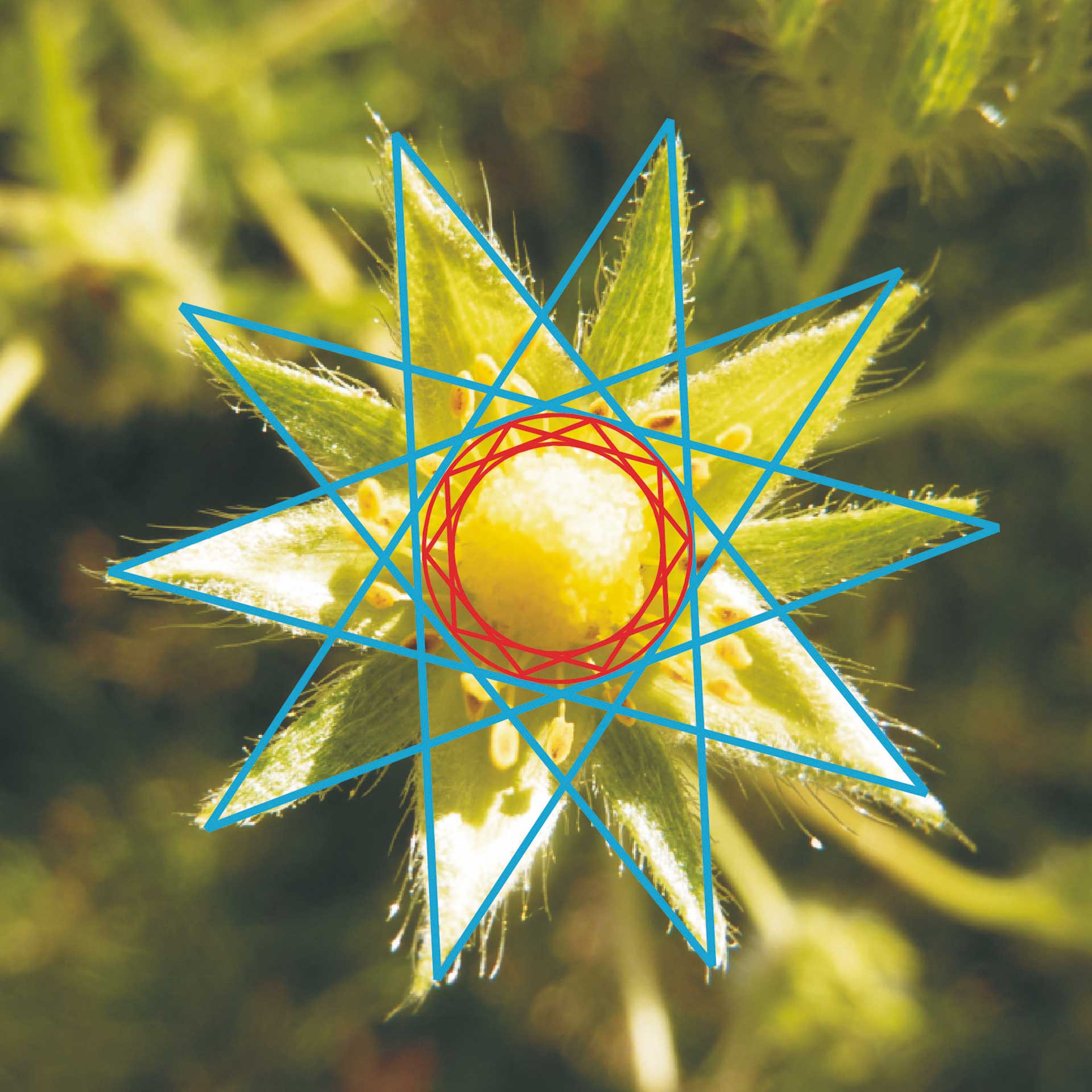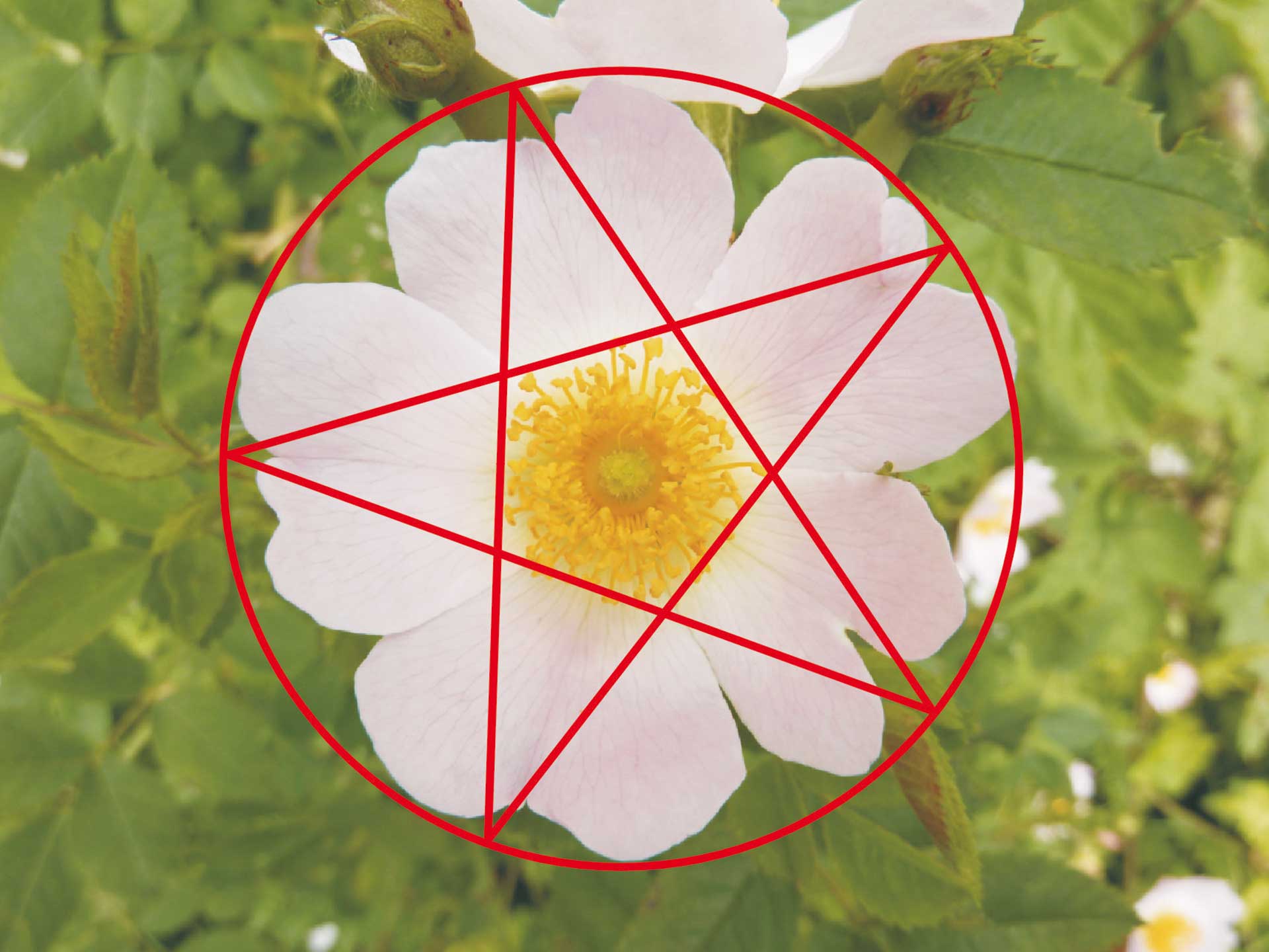 Die Blüte der Wilden Rose ist ein Paradebeispiel dafür, dass zutrifft, was Heraklit zur verborgenen Harmonie sagte. Ihre Macht in Form des unsichtbaren Pentagramms ist es hier, die das Verhältnis vom inneren Bereich mit den Staubgefäßen zur Gesamtblüte bestimmt. Sowohl bei der Planetenfigur als auch beim Wasserklangbild tritt außen zum Pentagramm noch ein Quadrat hinzu. Die Gesamtform ist also in beiden Gestaltbildungen von der Fläche her noch um eine Oktave größer als die Hauptform, die sich im mittleren Bereich befindet. Und damit kommen wir zur Oktave, das heißt zum Viereck, zur Zahl Vier (Abb. 10).