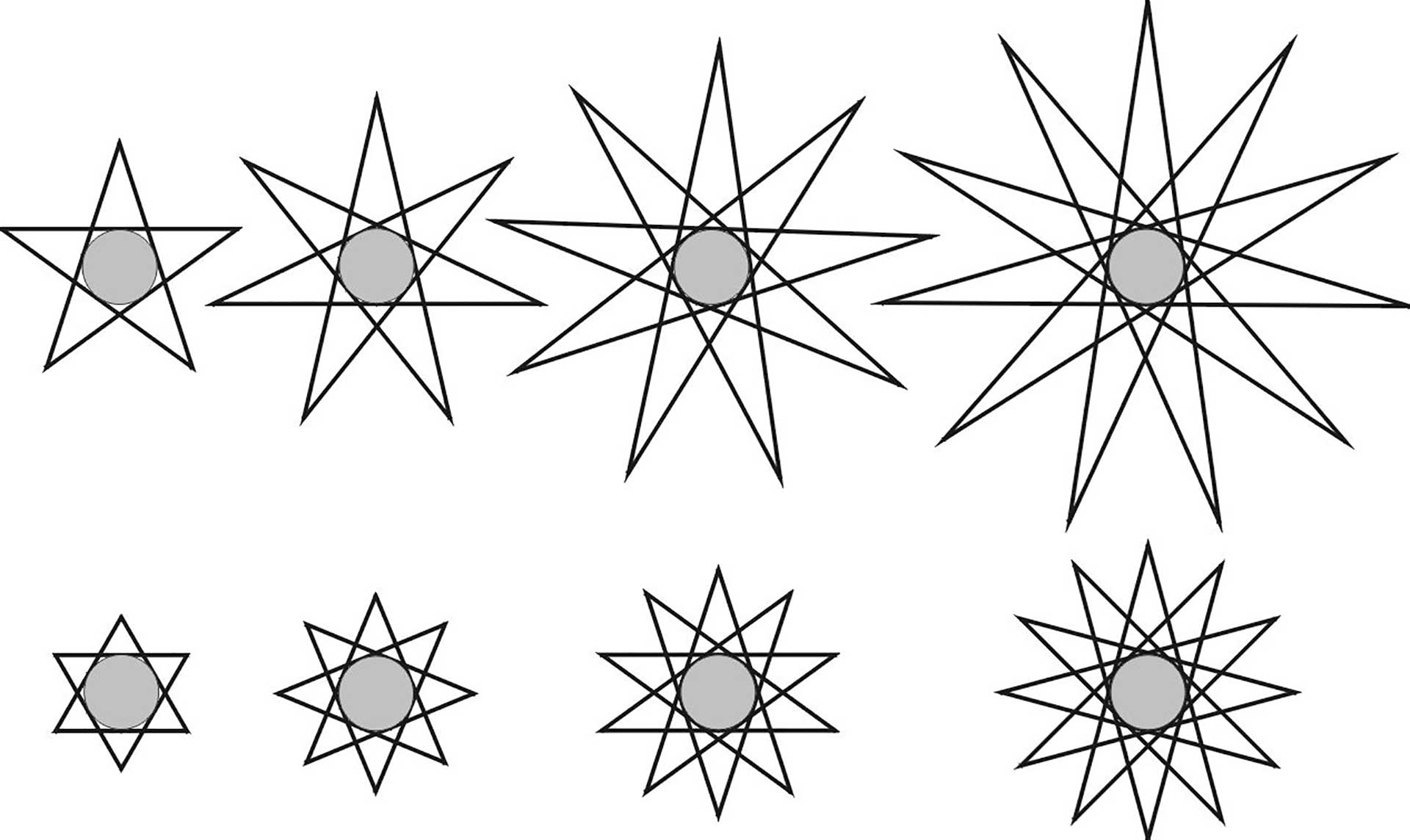 Doch wo sind in den Gestalten der Abb. 1 die zugrunde liegenden Sternfiguren? Im Wasserklangbild sieht man u.a. einen von der Mitte ausgehenden, strahlenförmigen sechszähligen Stern, aber sonst? „Verborgene Harmonie ist mächtiger als offenbare“, so sagte der griechische Philosoph Heraklit vor gut zweieinhalb tausend Jahren. Und auch hier wirken die Sternfiguren im Verborgenen. Um dies verstehen zu können, müssen wir uns mit den Gesetzmäßigkeiten der Sternfiguren vertraut machen. Dabei geht es hier stets um die regelmäßigen Figuren.