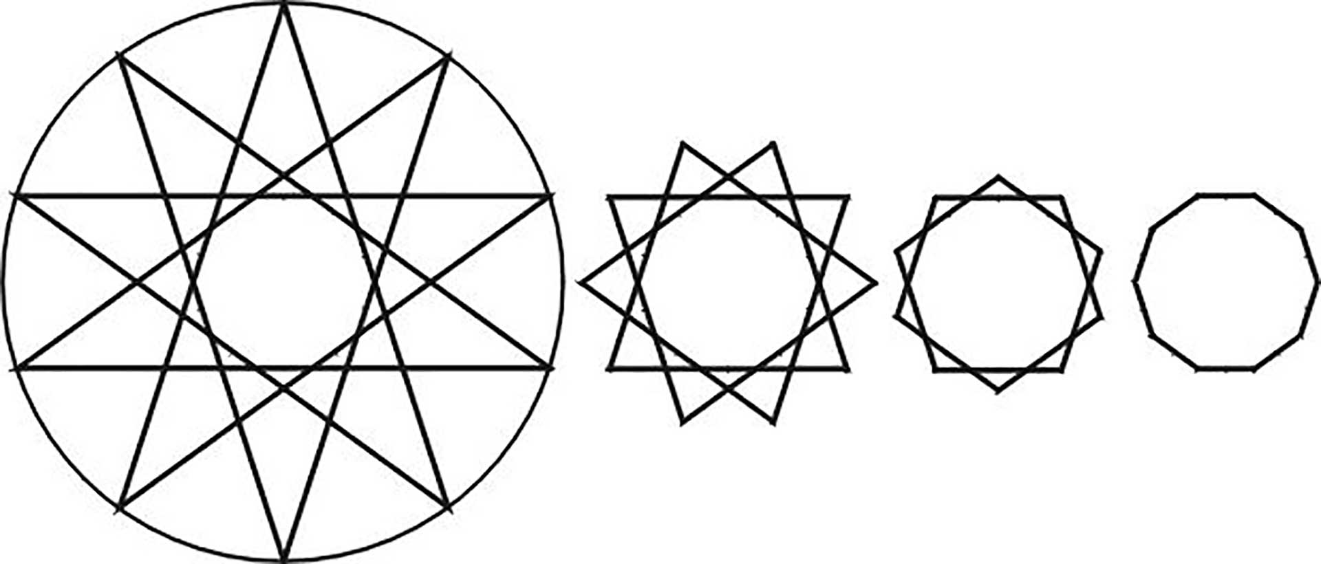 Fünf- und Sechsstern zeichnen innen ihr Polygon. Es gibt also insgesamt je zwei Figuren. Beim Sieben- und Achtstern sehen wir, dass zwischen dem großen Stern und dem Polygon noch eine weitere Figur durch die Linien des Sterns entsteht. Zusammen also je drei Einzelfiguren. Beim Achtstern setzt sich diese mittlere Figur aus zwei Quadraten zusammen, man spricht von einem Mehrfachpolygon. Neun- und Zehnstern haben zwischen Außen und Innen bereits zwei zusätzliche Figuren, insgesamt also jeweils vier Einzelfiguren. Der große Zehnstern besteht aus zwei Pentagrammen. Er ist damit der erste Mehrfachstern. In Abb. 3 sehen wir exemplarisch die drei möglichen Figuren aus dem großen Stern herausgezogen. Alle vier Figuren weisen wiederum einen gleich großen Inkreis auf (nicht eingezeichnet).