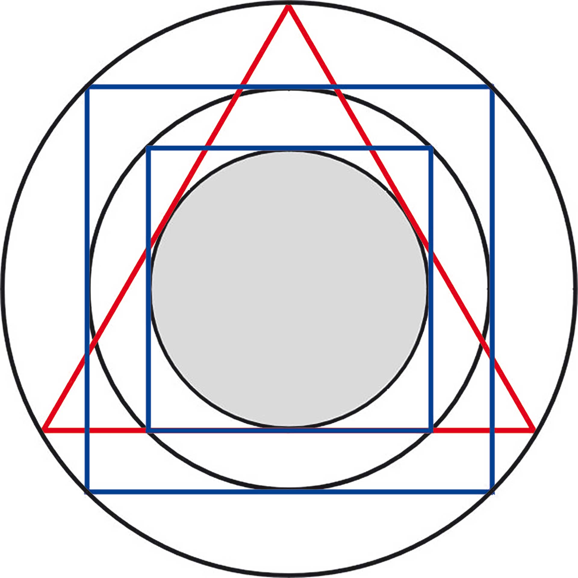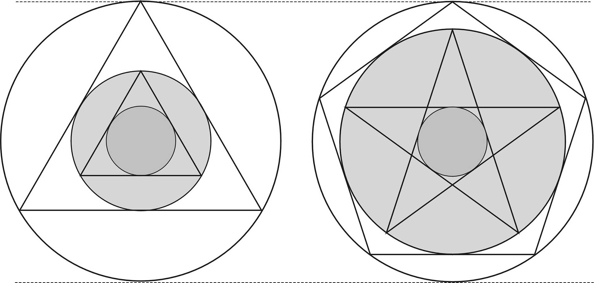 Diese Vorarbeiten reichen, um die allgemeine Gesetzmäßigkeit aufzuspüren, die alle Sternfiguren – also die Figuren aller Zahlen und die Einzelfiguren einer jeden Zahl – miteinander verbindet. Zunächst betrachten wir ein gleichseitiges Dreieck mit Um- und Inkreis (Abb. 4). Das Verhältnis ihrer Radien beträgt 2:1, was sich mit dem bloßen Auge relativ gut abschätzen lässt. Dieses Verhältnis (Proportion) entspricht musikalisch der Oktave. 1 Wenn wir ein weiteres Dreieck umschreiben, verdoppelt sich das Verhältnis (2·2=4). Der Radius des äußeren Kreises ist also viermal so groß wie der des grauen innen. Man kann nun von zwei Oktaven oder einer Doppeloktave sprechen. Nehmen wir jetzt ein Pentagramm und umschreiben dessen Umkreis noch ein Pentagon, ergibt sich exakt das gleiche Verhältnis. 2