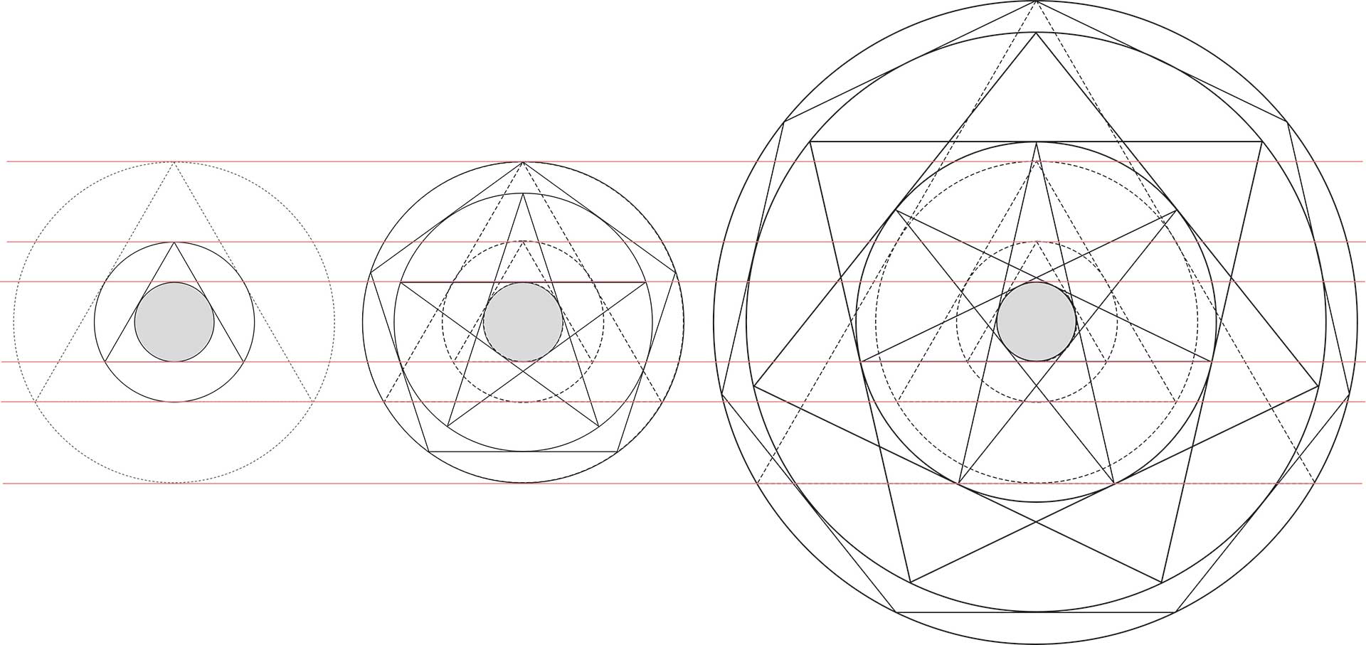 Die nächste ungerade Zahl ist die Sieben. Um den großen Siebenstern zeichnen wir die mittlere Sternfigur (die der große Stern in seinem Inneren selbst hervorbringt), dann dessen Umkreis, dann ein Siebeneck und schließlich noch einen Umkreis. Die gestrichelten Dreiecke zeigen, dass die Gesamtheit aller drei möglichen Siebener-Einzelfiguren mit der Konstruktion aus drei Dreiecken konsoniert. Wieder ist es mathematisch exakt. Musikalisch haben wir jetzt drei Oktaven. Der äußerste Kreis ist also achtmal (2·2·2=8) größer als der gemeinsame graue Inkreis. Die vier Einzelfiguren der Zahl Neun ergeben auf diese Weise vier Oktaven (16), bei der Zahl Elf sind es fünf Oktaven (32) usw.