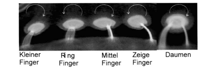 Die Kirlianfotografie ist bekannt. Auch sind Versuche bekannt, die Kirlianfotografie zu verbessern. In diese Richtung gehen die sehr interessanten Experimente des Entwicklungs-Ingenieurs Dieter Grimm. Er hat ein Gerät entwickelt, das das Energiefeld an den Fingerkuppen sichtbar macht, und zwar in der Bewegung. Mittels einer Videokamera wird das sichtbar gemachte Energiefeld auf einen Computer übertragen. Dort kann man dann das Feld zoomen und weitere Einzelheiten erkennen, auch können selbstverständlich die Informationen abgespeichert und weiter untersucht werden. Dieter Grimm sucht Kontakt zu anderen Forschern, die auf ähnlichem Gebiet arbeiten. Denn er ist sich wie raum&zeit bewußt, daß die für die Menschheit wichtigen Erkenntnisse im Bereich Lebens-Energie und Information eher im Spannungsfeld Bewußtsein, Gefühl, Energiefeld zu suchen sind als auf dem Gebiet der Gentechnik. Bevor Dieter Grimm sein Gerät kurz beschreibt, stellt er interessante Betrachtungen zum Thema Bewußtsein an.