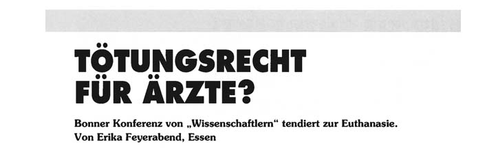 “Ihrem Kind konnte leider nicht mehr geholfen werden, das Behandlungsteam hat beschlossen, die Therapie zu beenden.” Das können künftig Eltern und Angehörige hören, wenn das verwirklicht wird, was entmenschte “Wissenschaftler” allen Ernstes auf einer Bonner Konferenz Ende Dezember in Bonn diskutierten. Das Recht der Ärzte zu töten, und zwar durch verhungern! Eine Handvoll faschistoider Ärztefunktionäre und “Bioethiker” in ganz Europa, einschließlich katholischer Theologen (!) wollen dafür sorgen, dass endlich auch in Deutschland wieder wie damals im KZ von wissenschaftlichen Frontkämpfern und Un-Ärzten entschieden werden darf, welches Leben lebenswert ist und welches nicht. Nach den Engländern, Iren, Holländern, Belgiern sollen nun die Deutschen an die Euthanasie herangeführt werden. Schließlich waren die Deutschen im Töten stets am perfektesten. Diesmal sind es nicht verquaste Rassentheorien, die das Leben unwert machen, sondern perverses Rentabilitätsdenken, das den Mord am wehrlosen Opfer moralisch rechtfertigen soll.