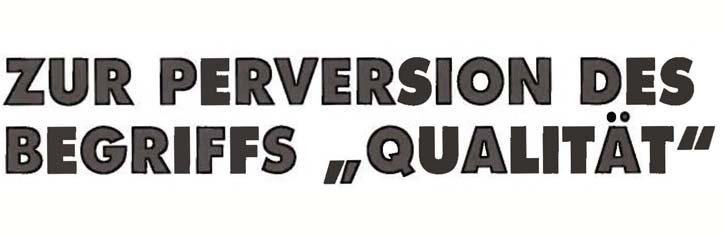 Unsere Sprache wird vorwiegend von sogenannten PR-Leuten zunehmend pervertiert. Aus der Abfallbeseitigung wurde der Begriff “Entsorgung” , Verseuchung heißt vornehm “Kontaminierung”, aus dem Waldsterbens-Bericht wurde inzwischen der “Waldschadens-Bericht” und die Zeitschrift, die international die finstersten Anschläge der Wissenschaft auf die Natur als Fortschritt der Menschheit hochjubelt (einschließlich Gentechnologie), heißt ausgerechnet “nature”! Am meisten Schindluder wird freilich mit dem Begriff “Qualität” getrieben. Da ist von “Lebensqualität” die Rede und gemeint ist ungehemmter Konsum, da gibt es Qualitätseier, Qualitätskuchen und -weine und nicht zu vergessen, die Qualitäts-Särge. Jeder versteht unter Qualität etwas anderes. Woran man sich möglichst ausschließlich und kompromißlos orientieren sollte, wenn es um die eigentliche Qualität geht, verrät hier der Autor.